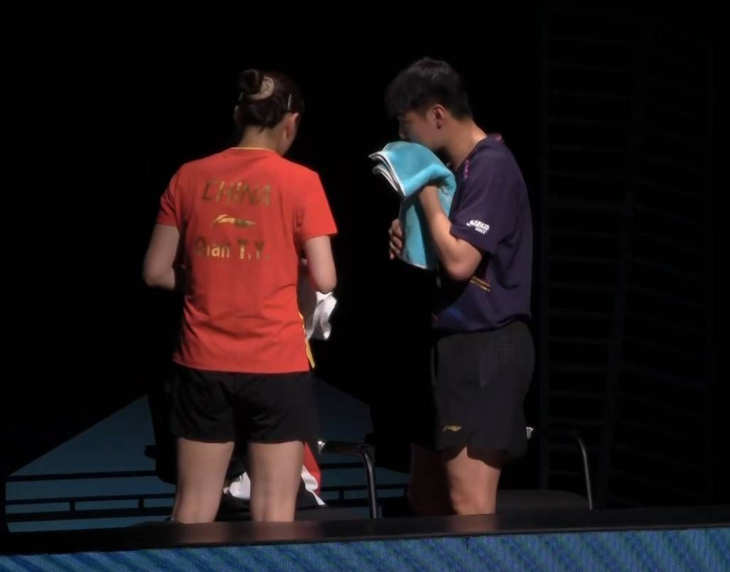 第三局双方胶着到局中,此时石洵瑶出现失误,被对手拉开分差,最终薛飞/钱天一局末保持优势,11-9占据主动。这一局薛飞/钱天一的发动非常好,衔接的准备也可以,这是他们占据优势的关键。